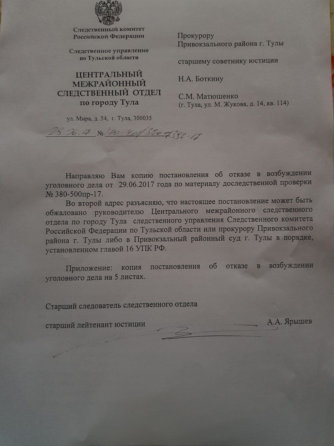 Центральный межрайонный следственный отдел Следственного управления Следственного комитета РФ по г. Туле сделал заключение о ЗАКОННОСТИ проведения внеочередного общего собрания членов ТСН 13.5.2017, а также избрания и регистрации Алехиной Л.М. как председателя ТСН. Матюшенко С.М. об этом уведомлена. Текст поставления об отказе по заявлению Матюшенко С.М., а так же выдержка из него размещены в разделе "УЧРЕДИТЕЛЬНЫЕ ДОКУМЕНТЫ"