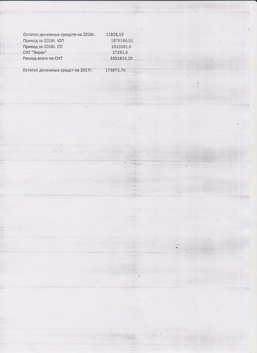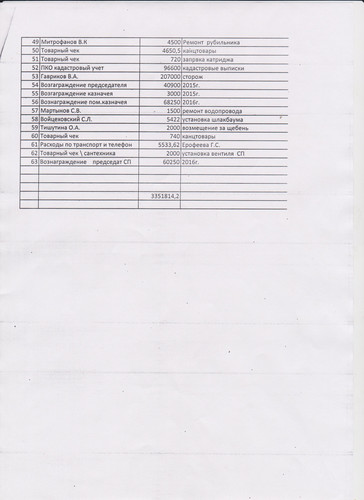 Такое чувство что Матюшенко С.М. просто тупо подгоняла это расход под деньги. И что вознаграждения за 2015г. она в 2015г не получала? Вот бы отчет за 2015г. посмотреть? И почему Егорову О.В. 90000, если 8*15000=120 000, А Полякова И.И. за охрану Южного поля получает 120 000, хотя всего 4 месяца *15000=60000 или у нас в году 14 месяцев стало, т.к. Олегу заплатили за 6 месяцев, а Поляковой за 8 месяцев. Зачем нужно заказывать кадастровые выписки на 96600? Зачем ремонтировать Рубильник за 4500, если его можно купить за 2500? Когда все дороги в ТСН разбиты и столбы надо меня, мы отсыпаем улицы и ставим столбы там где ни кто не живет, зато скупленные участки Матюшенко для перепродажи!!!! Где деньги, которые собирались на ремонт дороги? Не указаны деньги собранные и перечисленные по Газовому проекту, хотя договор заключен от имени ТСН!